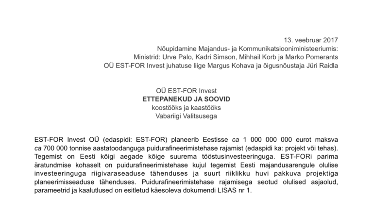Nõupidamisel osalenud Est-For Investi juhatuse liikme Margus Kohava sõnul on ja oli ettepanekute paketi eesmärk parandada Eesti riigi konkurentsivõimet suurprojektide planeerimisel võrreldes Põhjamaadega ning ettepanekute realiseerumine toetaks ka kavandatavat mahukat ja Eesti majandusarengu jaoks olulist investeeringut puidurafineerimistehase projekti.